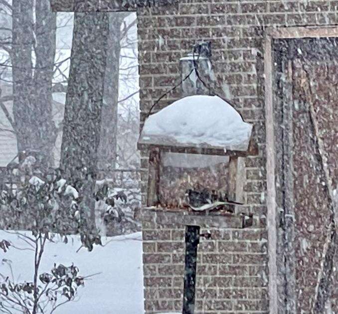 A junco visits a feeder as snow falls at a rate of more than an inch an hour during the height of Sunday’s storm. KELLY MONITZ SOCHA/TIMES NEWS