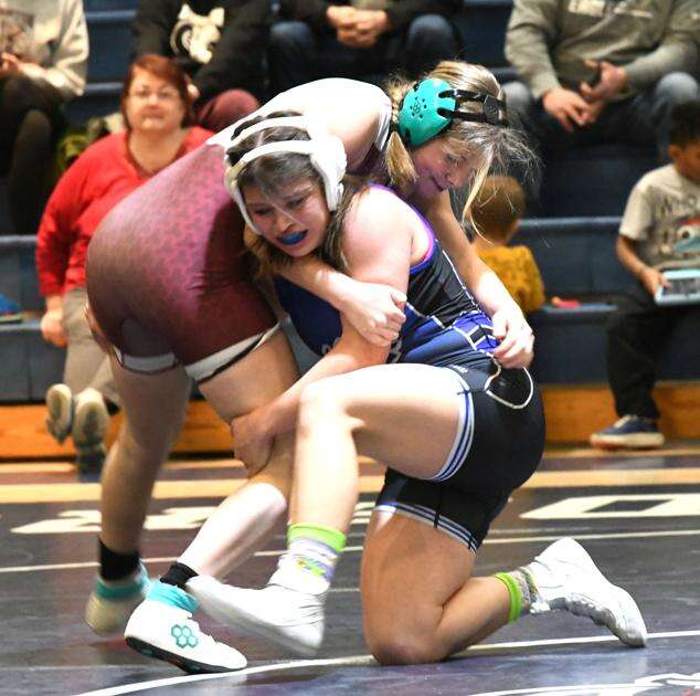 Pleasant Valley’s Josie Fetterman (right) works for control against Lehighton’s Lillian Klotz during their bout. RON GOWER/SPECIAL TO THE TIMES NEWS