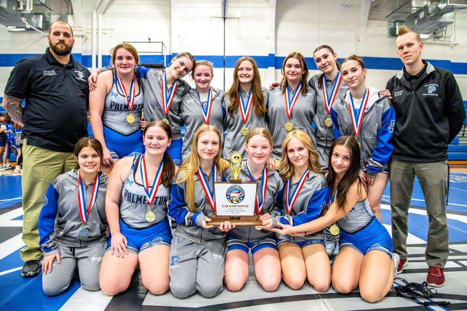 The Palmerton girls wrestling team, coached by Josh Rake (far right) won the Colonial League championship by posting an undefeated 7-0 record. MATT BREINER/SPECIAL TO THE TIMES NEWS