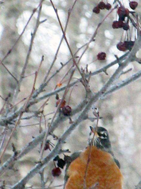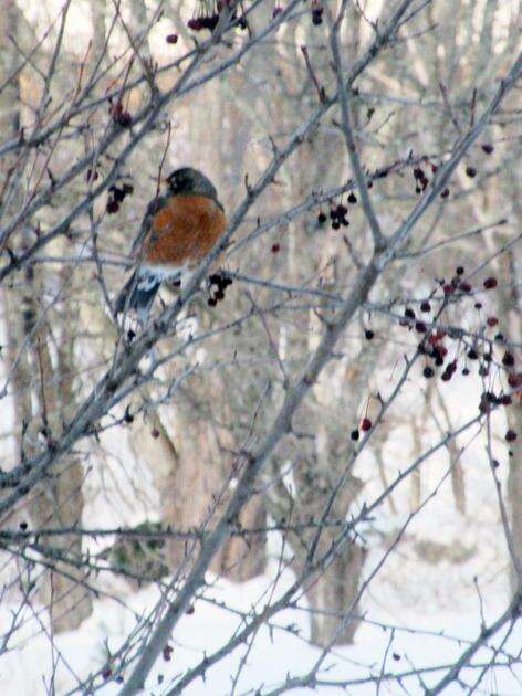 Gail Handwerk reported a robin sighting in her yard in Andreas. While the feathered creatures like to feed on worms in the springtime, they didn’t let the snow deter them. She said one perches on a branch and knocks berries down to the others. They arrived in a big group. CONTRIBUTED PHOTOS