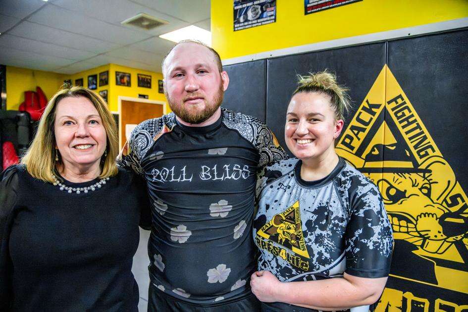 Dillon Masington stands with his mother, Sandi (left), and wife, Kayla, at Rat Pack Fighting Systems in Palmerton. Family support played a key role in Masington’s recovery as he returned to the mats following a lengthy health-related absence. MATT BREINER/SPECIAL TO THE TIMES NEWS