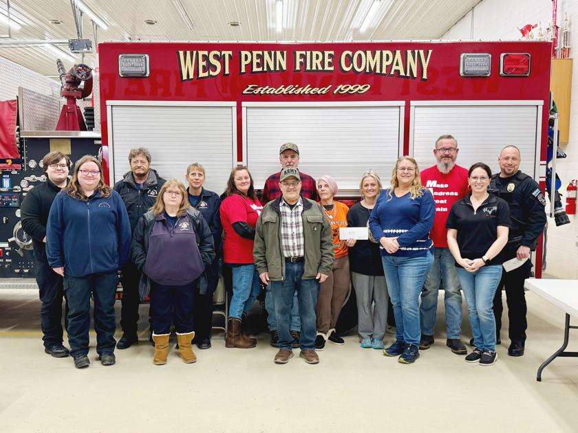 Andreas Sporting Club’s commitment to giving back to the community this year included donations in the amounts of $3,000 to West Penn Fire Company, $1,500 to Penn Mahoning Ambulance, $1,000 to Mahoning Valley Ambulance, and $500 to D.A.R.E. in care of West Penn Police Department. Representatives from each organization attended West Penn Fire Company’s general meeting this week to receive the donations. Front row, from left: Emily Swolensky, public relations supervisor, Mahoning Valley Ambulance; Valerie Coombe, president, Penn Mahoning Ambulance; Jim Knappenberger, president, Andreas Sporting Club; Dahna Phillips, financial secretary, sporting club; and Stephanie Krause, sporting club trustee. Back row, from left: Zachary Swolensky, EMT, Mahoning Valley Ambulance; Gerald Coombe, captain, Penn Mahoning Ambulance; Karen Crostley, vice president, Penn Mahoning Ambulance; Kathy Kromer, steward, ASC; Hans Krause, vice president, sporting club; Barb Knappenberger, treasurer, sporting club; Rebecca Easterday, vice president, West Penn Fire Company; Doug Bachert, field captain, sporting club, and Jason Lorah, chief, West Penn Police Department. CONTRIBUTED PHOTO