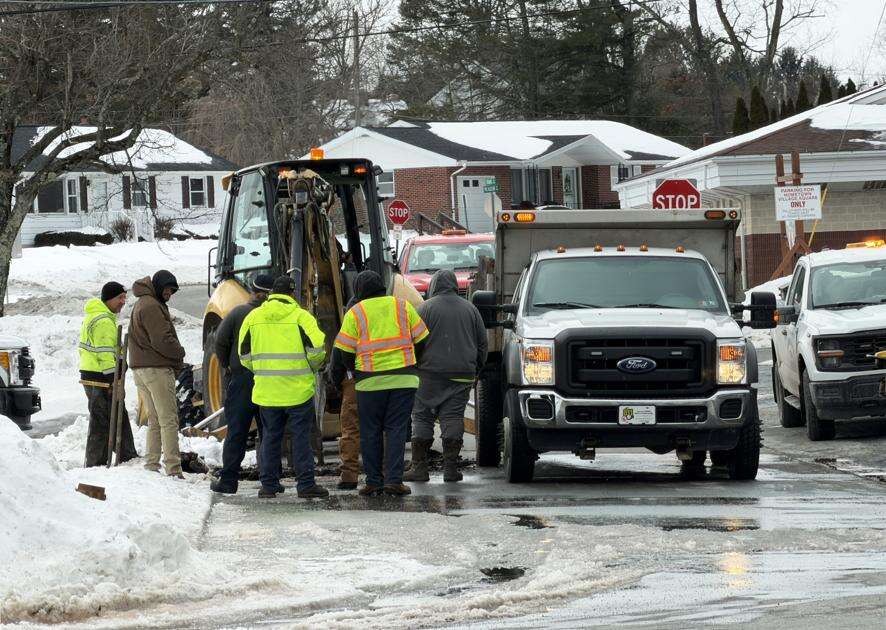Snow plowing and removal duties coupled with water main breaks and maintenance issues have kept local municipal crews working nonstop. Here, workers from Rush Township begin digging pipes related to a service break on Wyoming Avenue just off Claremont, Route 309, on Thursday afternoon. DONALD R. SERFASS/SPECIAL TO THE TIMES NEWS