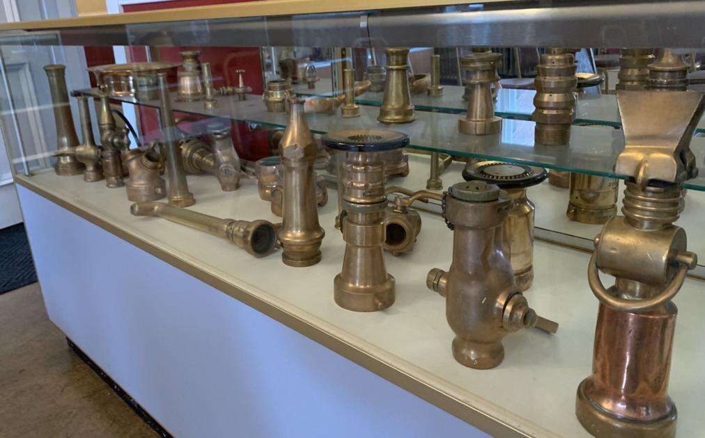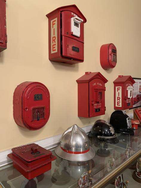 Visitors can see fire alarm pull boxes, antique fire extinguishers and flashlights, brass fittings and nozzles from long ago, and wooden water mains and old radios. The fire company’s meeting room, with antique table and chairs, remains.
