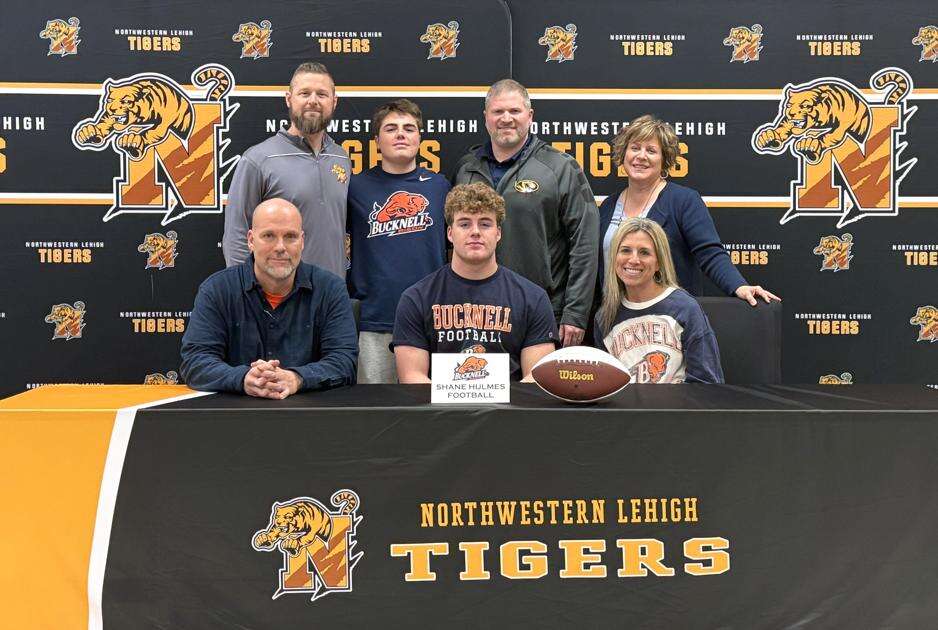 Northwestern’s Shane Hulmes (seated, center) will continue his academic and football careers at Bucknell University. With Hulmes at a signing ceremony at the high school were his parents Ryan and Ashley (front row). In the back row, from left, are Tigers head football coach Josh Snyder, Shane’s younger brother Caleb, assistant coach Greg Mitchell and Northwestern Principal Aileen Yadush. CONTRIBUTED PHOTO