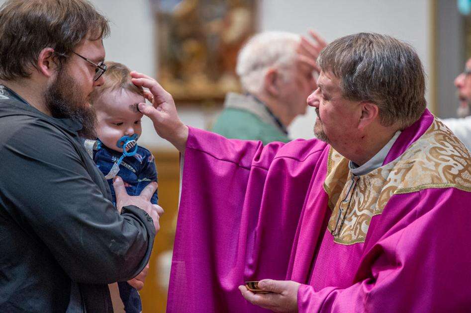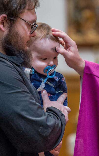 Joshua Clemens holds his 11-month-old son, Thomas, as the Rev. Eric Gruber, pastor of St. Joseph Parish of the Panther Valley in Summit Hill, places a cross of ashes on his forehead during Ash Wednesday services Wednesday morning. Ash Wednesday is a day which officially starts the beginning of the Lenten season observed by Christians around the world. The 40-day observance is a period of prayer, fasting and sacrifice that leads to the vigil of Easter, which will be celebrated this year on April 5. The ashes represent a token of penitence and mortality. AMY MILLER/TIMES NEWS