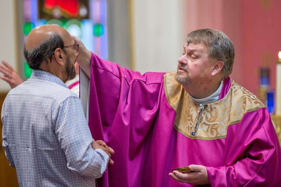 Above: The Rev. Eric Gruber, pastor of St. Joseph Parish of the Panther Valley in Summit Hill, places a cross of ashes on Jack Reiber’s forehead during Ash Wednesday services Wednesday morning.