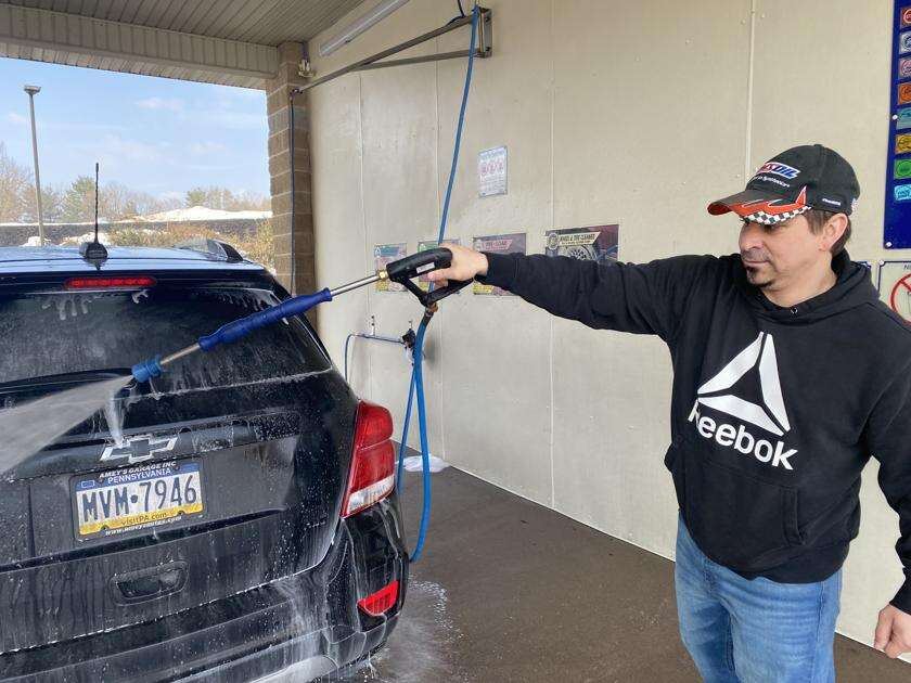Austin Santee of Summit Hill cleans off his car at Lehighton Car Wash on South Fourth Street in Lehighton on Tuesday afternoon. Santee, who was accompanied by his wife and 8-month-old son, said he was off work for the day and figured he would take advantage of the comfortable weather, a rarity in what has been an otherwise significantly cold and long winter. The forecast for the next several days includes more rain and snow. TERRY AHNER/TIMES NEWS