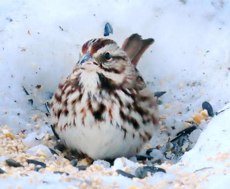 For at least three evenings, a lone song sparrow was the last to feed as daylight faded. Even the pair of cardinals left the feeder area before the sparrow.