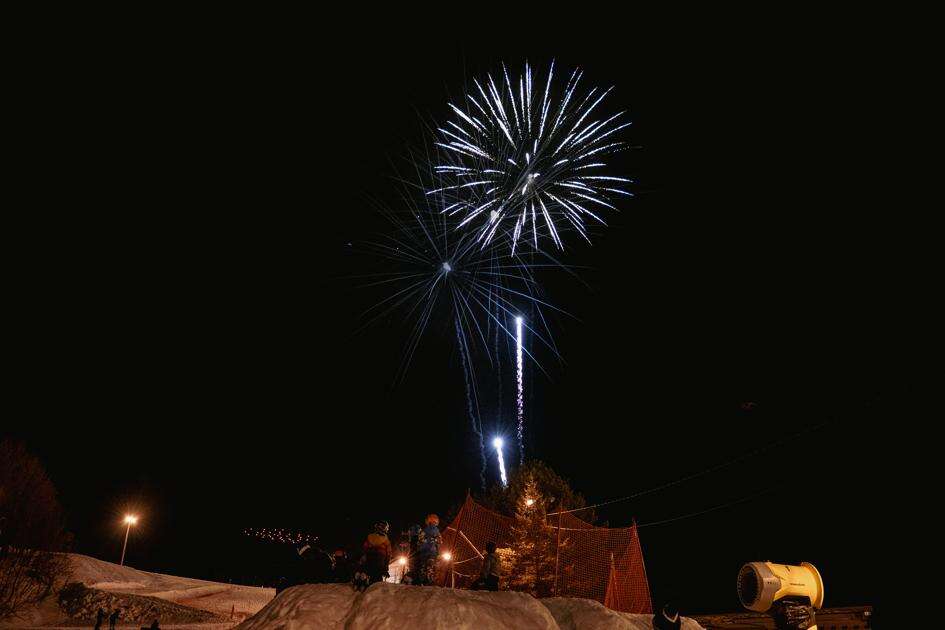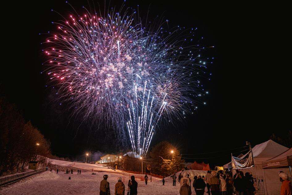 Left: Fireworks light up the night sky during Blue Mountain Resort’s annual winter fest.
