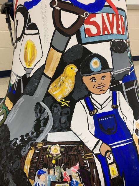 “We have it near the mine,” she explained, motioning to a coal miner, shovel and mine. “They would bring this bird down into the mine to see if the oxygen was good enough.”