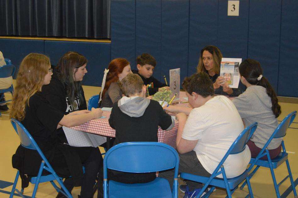 Sixth grade students at Towamensing Elementary listen to Principal Kelli George read on Thursday during a “book tasting” event in the gymnasium. Students spent 10 minutes at each of four different stations, being introduced to different authors, genres and cultures in a fun, immersive environment. With George are students Benjamin Yaraslovsky, Taylor Santee, Paige Hewko, Hailey Pisulak, Gavyn Pippinger, Landon DiDario and Marlie Moninghoff. JARRAD HEDES/TIMES NEWS