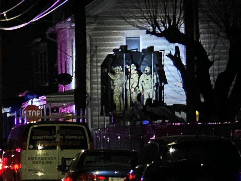 The state police SERT team was on scene. Members of the state police SERT team penetrate a second floor window to release a drone inside the residence.