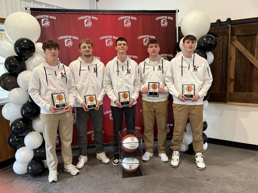 The Lehighton Boys Basketball team held their end-of-season banquet at Valley View at Yenser’s in Lehighton. At the event, the program recognized its award winners. They included, from left, Aiden Solt (Defensive MVP), Blake Roberts (Offensive MVP), Cole Dietz (Overall Team MVP), Caden Meek (Coaches Award) and Talin Fairchild (Sportsmanship Award). The award winners were presented with a plaque from the Lehighton Boys Basketball Parent’s Club. Dietz also received two commemorative basketballs for reaching 1,000 career points and breaking the school record for most three-pointers in a career. CONTRIBUTED PHOTO