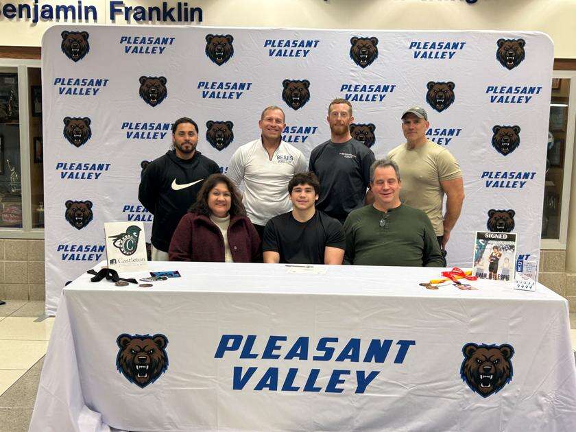 Pleasant Valley wrestler Evan Gillespie (seated, center) will continue his academic and athletic careers at Castleton University in Vermont. Gillespie plans on being a member of the Spartans wrestling team, which is a Division 3 top 10 program. Also attending the signing ceremony were his parents Jackie and Doug Gillespie, Jordan Toledo, PV head wrestling coach James Weiss, Robert Kays and Michael Erhardt.