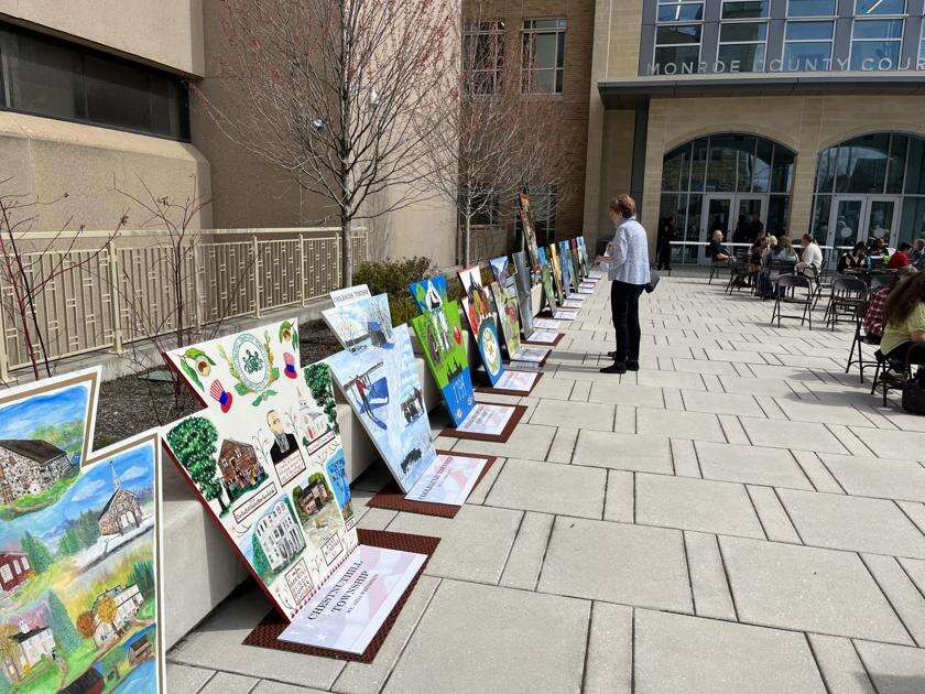 Monroe County Commissioner Sharon Laverdure looks at the decorated keystones painted to celebrate the 250th anniversary of the founding of this country. Each township will have a keystone painted honoring it. They will be displayed at the municipal buildings. On Wednesday, they were displayed for the Founders Day celebration at the courthouse in Stroudsburg. KRISTINE PORTER/TIMES NEWS