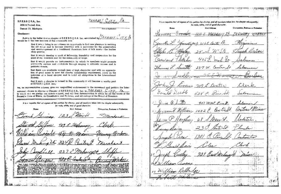 The original charter for the Coalcracker Barbershop Chorus from 1951.