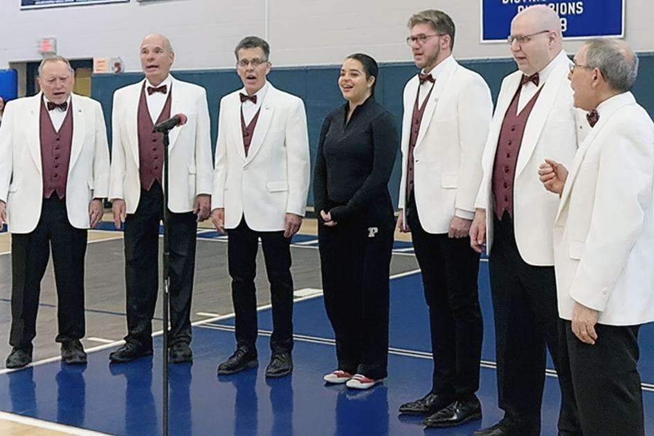 Coalcracker Barbershop Chorus members perform at a Tamaqua Area High School basketball game and were joined by student Carla Castro, fourth from left. Also shown, from left, are Blake Tharp, Mike Kitsock, Artie DiCasimirro, Adam Bachert, Chris Metzger and Larry Sabino. CONTRIBUTED PHOTO