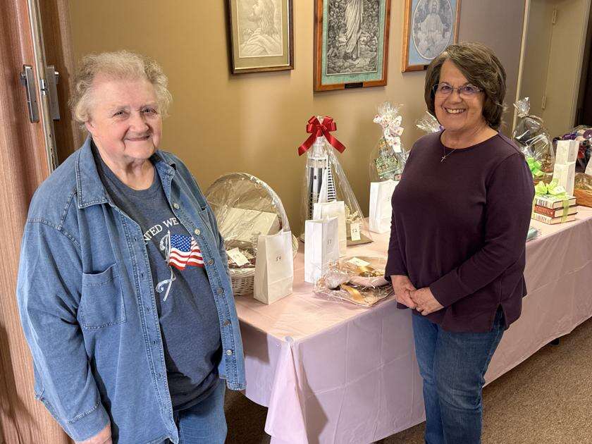 Sylvia Storm and Carol Hunsicker, both members of Jacob’s UCC, Weissport, display some of the items in the basket auction held recently. The church holds one every spring, and one every fall. There was the basket auction where people had a chance to bid on items like books, cash donations, a lottery ticket basket, an afghan, bath towels, snack baskets, crafts, and more.The also had a table selling homemade baked goods and homemade candy, plus a craft table, and a table selling America250 T-shirts and other items. The kitchen was open, selling delicious homemade foods. JAMES LOGUE JR./SPECIAL TO THE TIMES NEWS