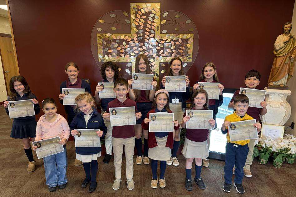 Amy Hannis-Miskar, principal, recently announced the St. Jerome Regional School Christian of the Month students for March are, front, from left, Isaela Rodriguez, Preschool; Natalia Holland, Kindergarten Blue; Carson Breiner, 2 Blue; Ava Woodring, 1 Gold; Jordan Miller, 2 Gold; and Dennis Lucas, Kindergarten Gold. Back row, Giada Carsia, 3rd Grade; Madison Greene, 6 Blue; Isaiah McGinley, 5th Grade; Brianna Heater, 7th Grade; Lillian Porambo; 8th Grade, Adalyn Bones, 6 Gold; and Keyller Gonzalez, 4 Blue. Missing from the photo are Riley Garvey, 4 Gold, and Erik Lutz, 1 Blue. The Christian of the Month Award recognizes students who display good character on a consistent basis and serve as student role models throughout the month. CONTRIBUTED PHOTO