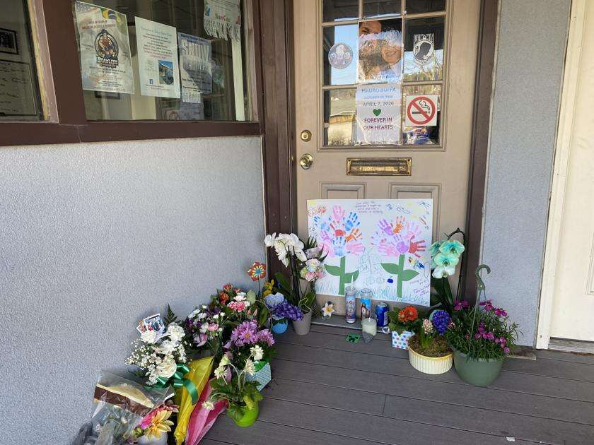 Flowers, pictures, cards and other tokens of affection have been dropped off at the doorstep of Mauro’s Barber Shop at 212 Delaware Ave.