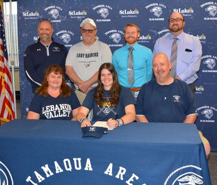 Ceanna Gormley, seated center, a Tamaqua High School senior, signs a letter of intent to play softball at Lebanon Valley College. Looking on are, seated from left, her parents Lori and Jim Gormley; standing from left, Mike Hromyak, high school athletic director; Tony Zancofsky, varsity softball coach at Tamaqua; Jim Hahn, assistant high school principal, and Tom McCabe, high school principal. Jim Gormley is also the JV softball coach at Tamaqua. RON GOWER/SPECIAL TO THE TIMES NEWS