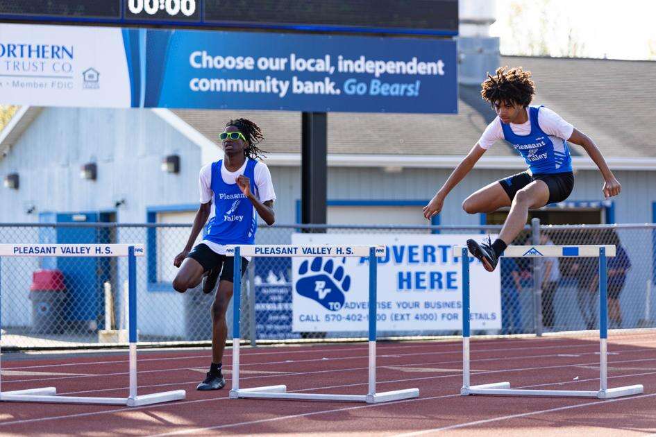 Pleasant Valley’s Zaire Cotton and Nathan Thompson compete in the 300 meter hurdles. TAJ FALCONER/SPECIAL TO THE TIMES NEWS