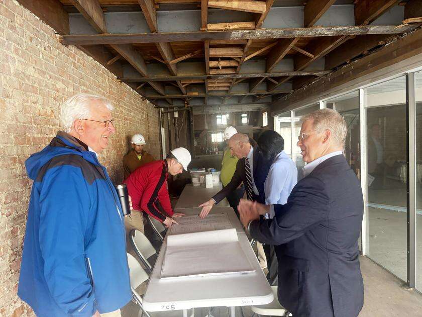 State officials and representatives from Temple University look over plans to create housing for dental students at 24 W. Broad St. in Tamaqua. Work on the housing and a dental education clinic for Temple University began recently. CONTRIBUTED PHOTO