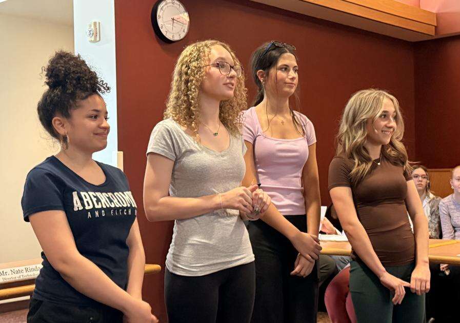 Carbon Career & Technical Institute cosmetology students spoke to the CCTI Joint Operating Committee. From left, they are: Analysia (Ana) Rodriguez, Lehighton senior; Emily DeFuso, Jim Thorpe junior; Katerena (Rena) Papahritos, Palmerton senior, and Macie DeVino, Palmerton junior. JAMES LOGUE JR./SPECIAL TO THE TIMES NEWS