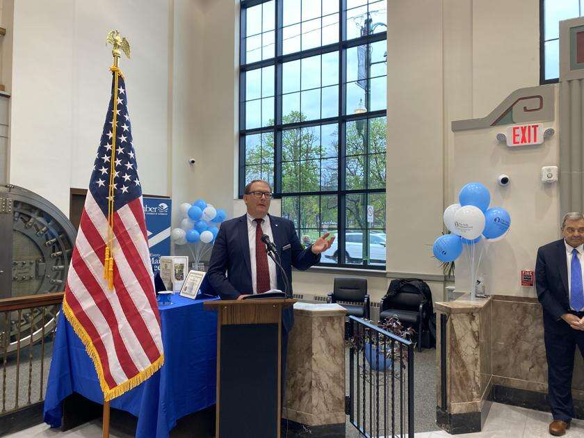Kevin Schmidt, president and CEO, The Neffs National Bank, addresses the crowd as part of a ribbon cutting held Wednesday at The Neffs National Bank Palmerton branch location at 372 Delaware Ave. in the historic building that was once The Citizens Bank and Trust Company. TERRY AHNER/TIMES NEWS